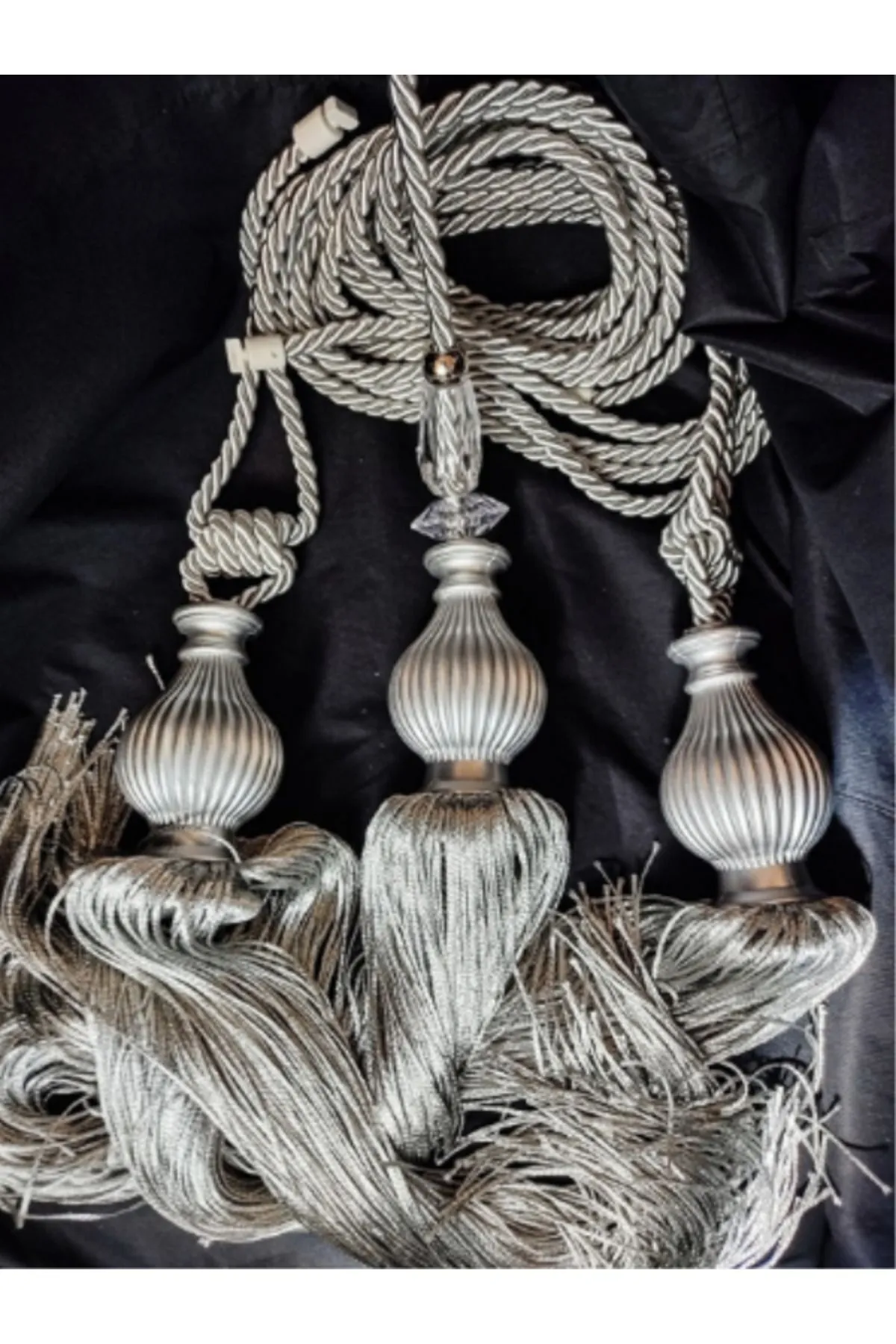 Ana Sayfa Perde Aksesuarları Fon Perde Tavan Bağlama Püsküllü 3’lü Braçol Set Gümüş