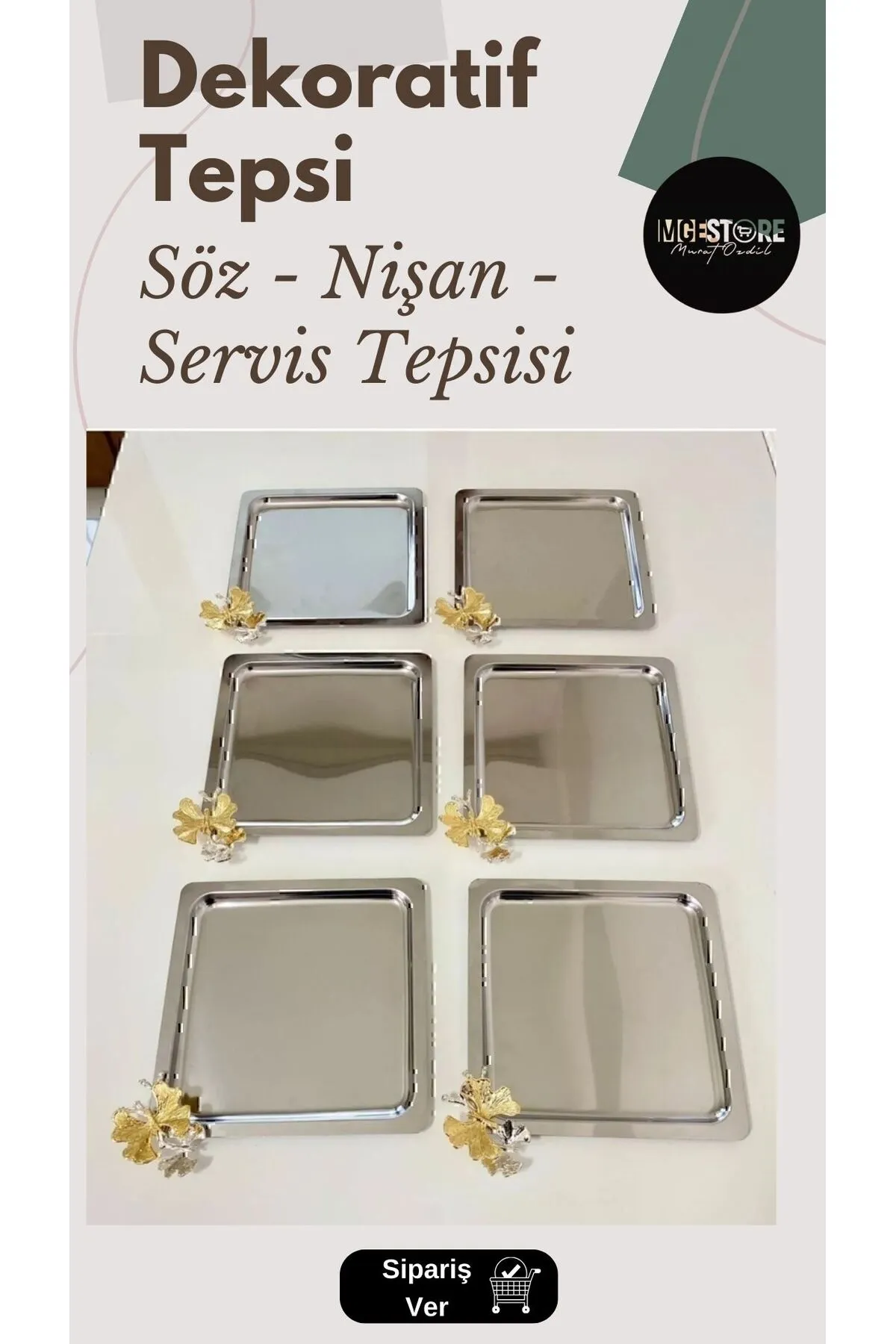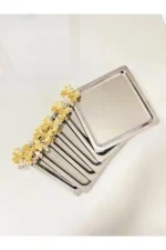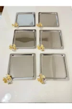 Kelebek Aksesuarlı Kare Paslanmaz Çelik 6’lı Gümüş Kahve, Çay, Dekoratif Sunum Servis Söz Tepsisi
